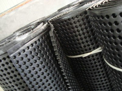 圓錐突臺(或中空圓柱形多孔)的塑膠底板,由高抗沖聚苯乙烯(HIPS)制成。圓錐突臺(或中空圓柱多孔)的頂面膠接一濾層土工布,以阻止泥土微粒通過,從而避免通道阻塞,使孔道排水順暢。