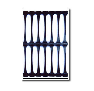 單向拉伸的土工格柵是由高分子聚合物經擠出壓成薄板再沖規則孔網,然后縱向拉伸而成。這種過程中使高分子成定向線性狀態并形成分布均勻、節點強度高的長橢圓形網狀整體性結構。此種結構具有相當高的拉伸強度和拉伸模量,特別是我公司此類產品更具有高水平的高早期(伸長率在2%—5%)拉伸強度和拉伸模量。給土壤提供了理想的力的承擔和擴散的連鎖系統。該產品拉伸強度大(>150Mpa),適應各種土壤,是目前廣為采用的加筋加固材料。